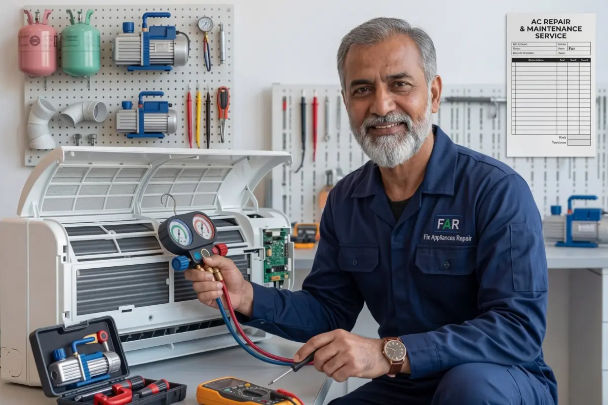 The cost of AC repair in Dubai typically starts from AED 150 for a basic inspection and diagnostic visit. The final price depends on the specific fault, such as a capacitor replacement, fan motor repair, or gas refill. At FAR (Fix Appliances Repair), we provide an upfront, transparent quote before any work begins to ensure there are no hidden charges.